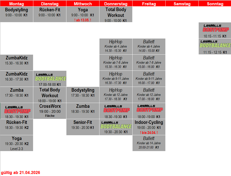 Hier finden du alles, was du brauchst. Nimm an über 25 Kursen pro Woche teil